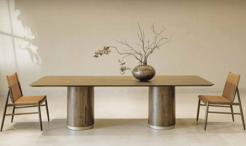 Seu design destaca a estrutura em madeira maciça com linhas levemente inclinadas, que trazem leveza visual e sofisticação.