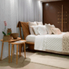 Cama You, design minimalista e elegante. Ela se destaca pela estrutura em madeira, linhas limpas e cabeceira estofada, proporcionando um ambiente de descanso tranquilo. A cama também possui um toque de memória afetiva devido à sua estrutura que mescla linhas retas e curvas, e ao encosto com estofamento amassado.