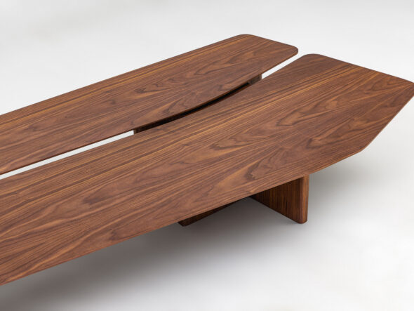 Explora o universo dos alinhavos, é uma peça com visual leve e delicado. A madeira dos pés é tratada como um “fio” que é “costurado” no tampo convergindo para o vão central que fica em evidência, assim como o botão em uma peça de alfaiataria. A posição dos pés maciços deixa o tampo laminado com as quinas em balanço, proporcionando uma sensação de leveza.