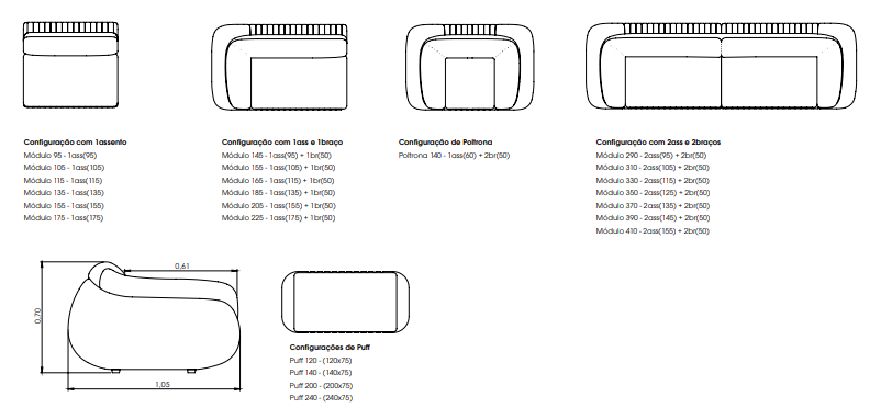 Assento e encosto fixos modular, espuma Ultracel – espuma diferenciada de elevada durabilidade, maciez e coeficiente de deformação próximo a zero.